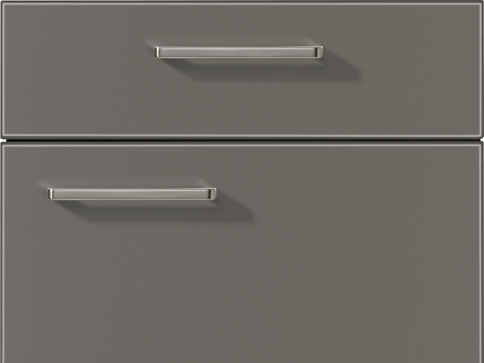 This home design combines modern materials with natural accents. The matt fronts in the titano matt glass look harmonize perfectly with the warm wood look of the back wall and the glass doors of the wall cupboard, which ensures stylish organization.
