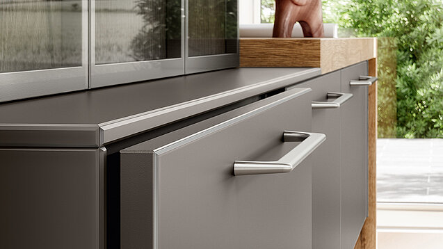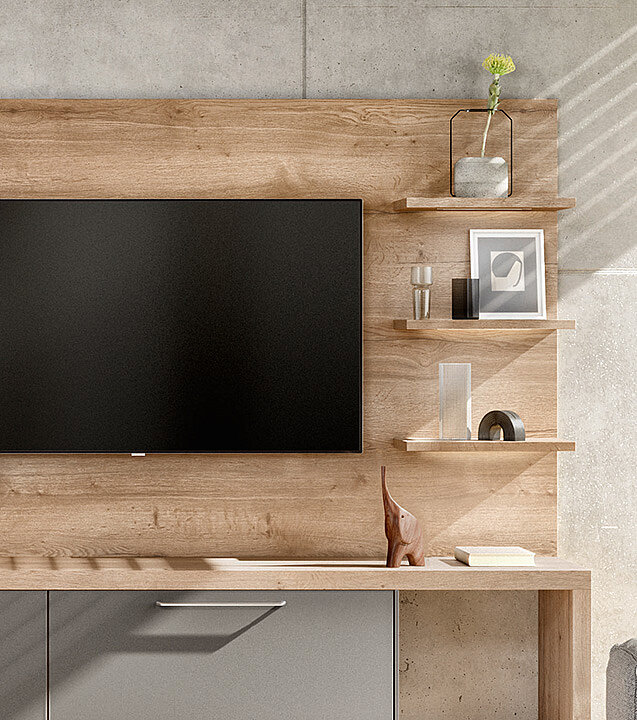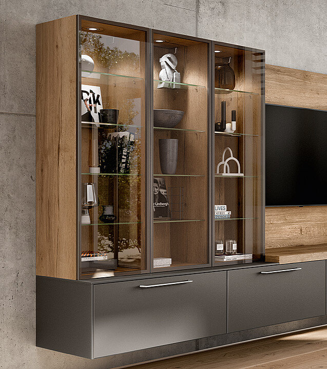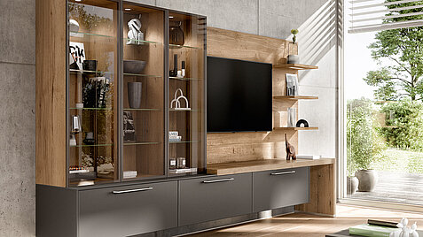 This home design combines modern materials with natural accents. The matt fronts in the titano matt glass look harmonize perfectly with the warm wood look of the back wall and the glass doors of the wall cupboard, which ensures stylish organization.