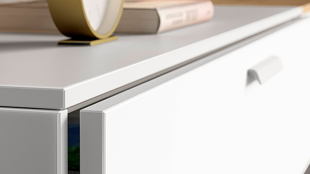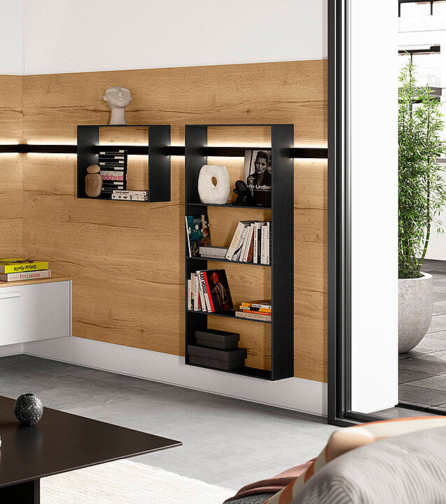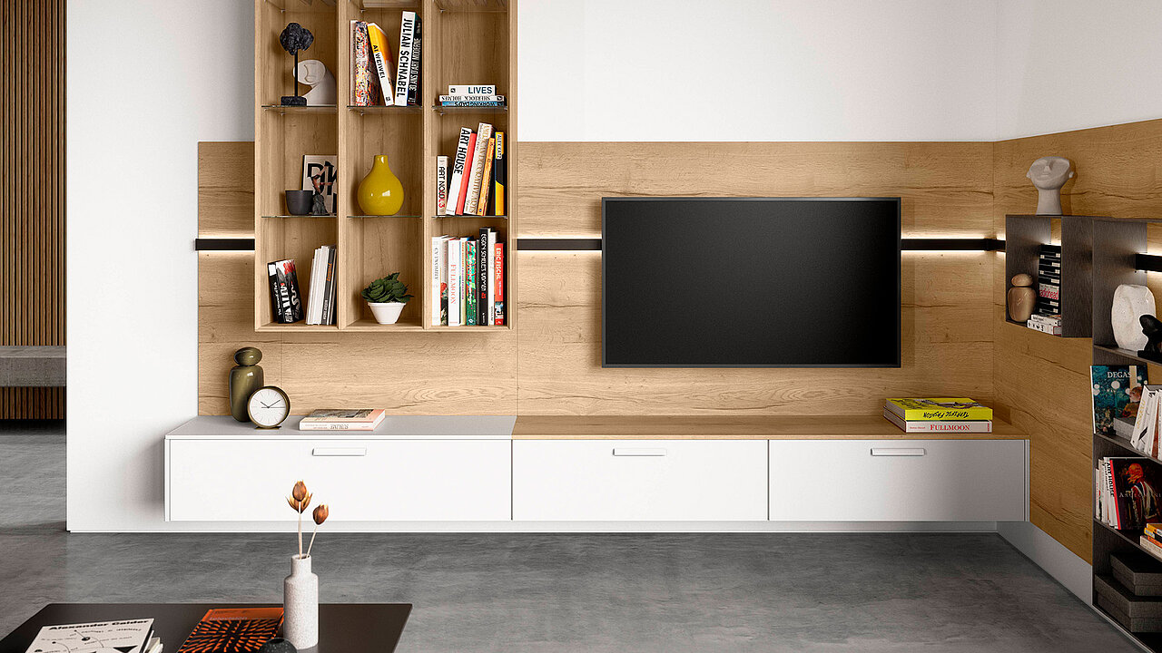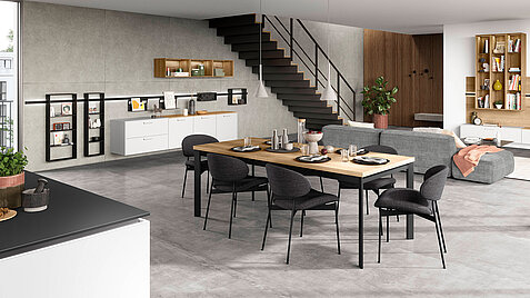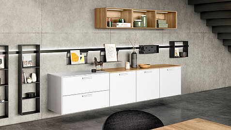 What a combination! This design also impresses with its exciting material concept. The sideboard has matt satin-finished fronts in an effective glass look. The facetted shelf has a natural oak look and the individual Sign Emotion aluminum railing system has a very modern design in black.