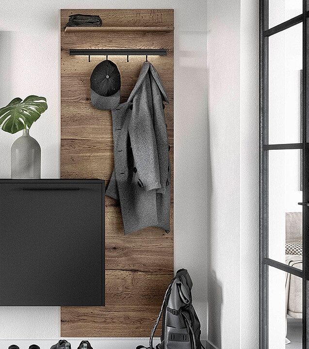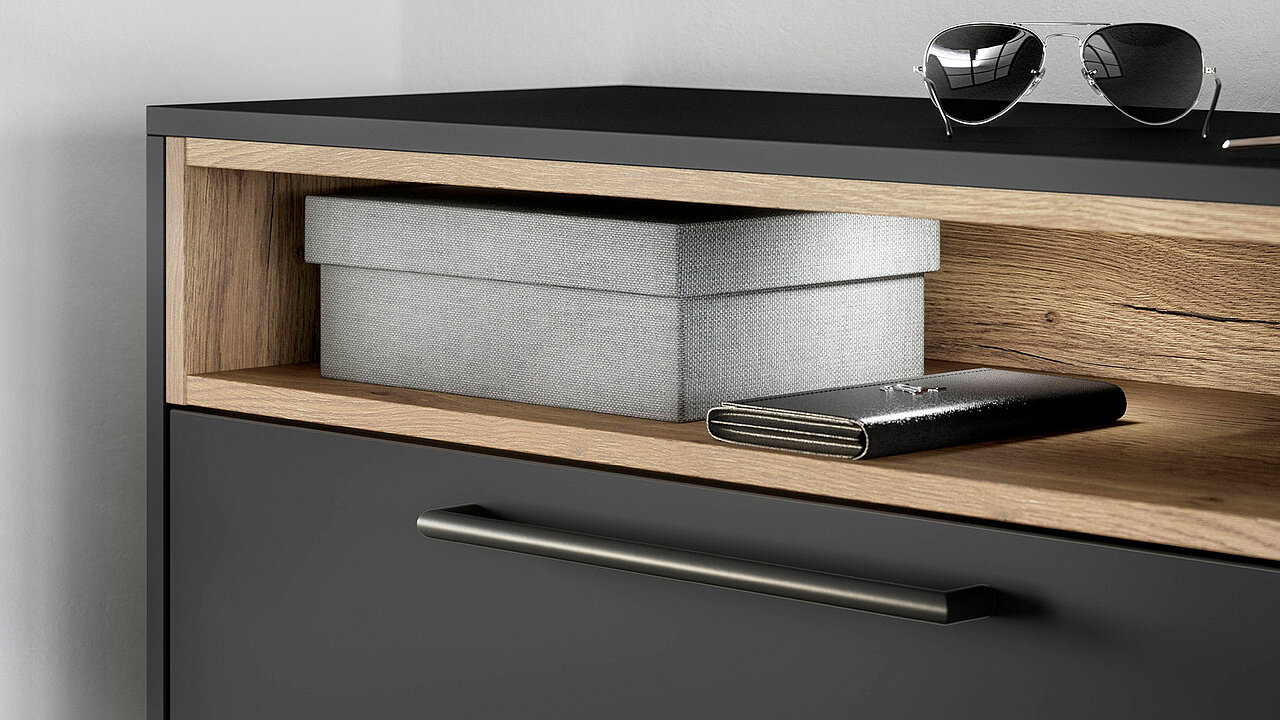 An elegant welcome. The floating sideboard in ultra-matt black with tone-on-tone handles is complemented by the oak-look wall shelf. Combine it with a large mirror that blends in harmoniously.
