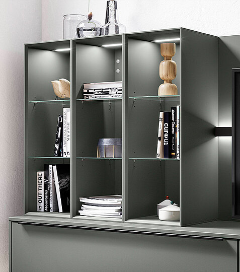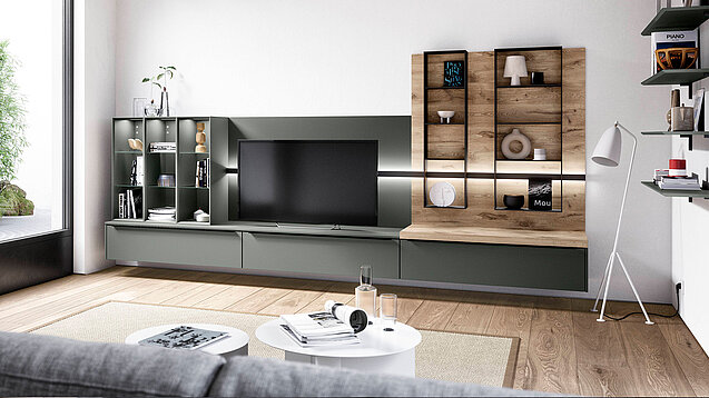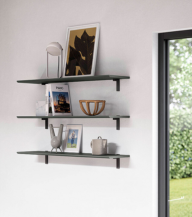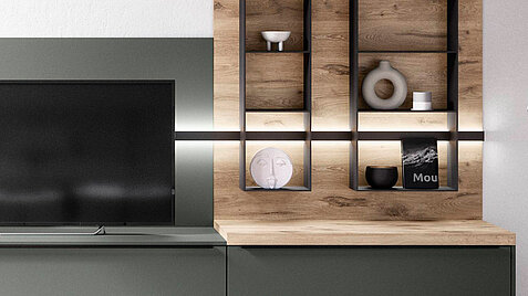 Shelving gives a design more openness and freedom. The combination of different shelf types in one color tone looks particularly harmonious. Naturally beautiful: the oak decor and the Sign Emotion railing system.