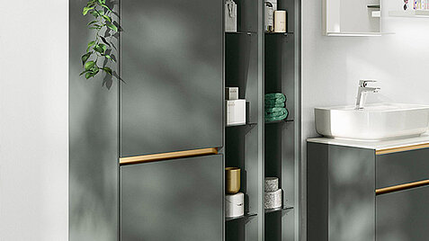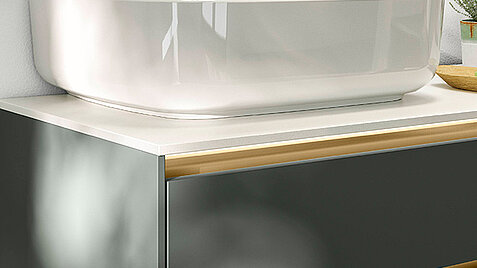 Beautiful contrasts: Combine hand basin tops with a real ceramic surface or elegant marble structure with gold or black recessed handles – discover your options from our wide range of decors.