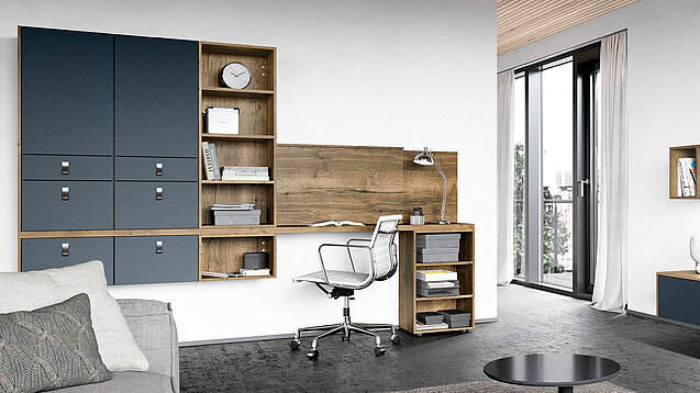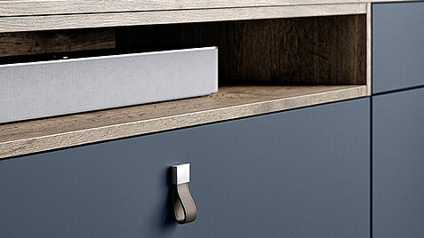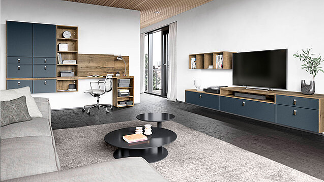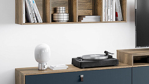 The simple design of the sideboard and shelving elements offers a fresh look and a well thought-out and exceptionally flexible storage space concept as well as impressive detailed solutions, such as the storage compartment for receivers and other items, available in 30 different colors.