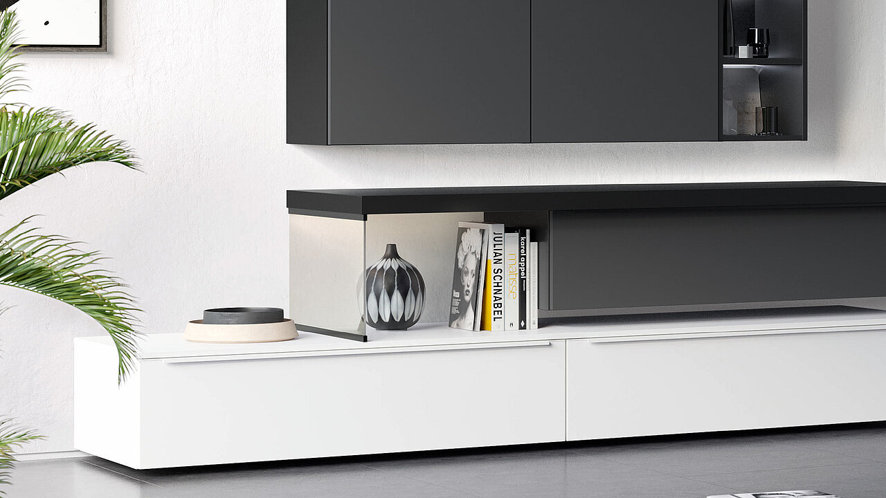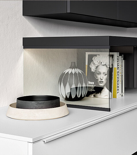 Light meets dark to create a clear urban aesthetic. Basics for the look: cabinets and shelves with black carcasses and easy-care anti-fingerprint fronts. Glass as a design element adds extra lightness.