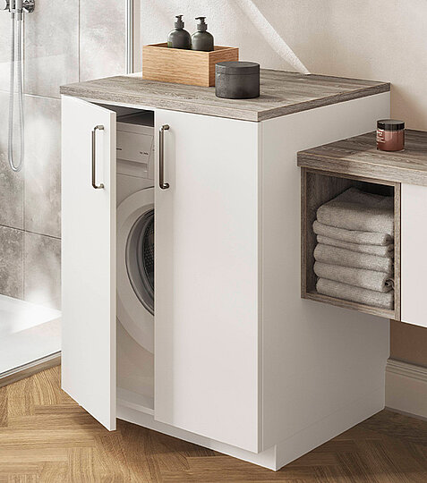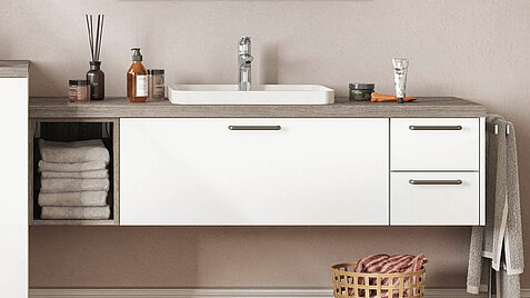 It’s clear that the bathroom is tidy and stylish. The idea: open storage space solutions that offer optimum storage options in combination with closed options. The elegant look in white underlines the minimalist style.