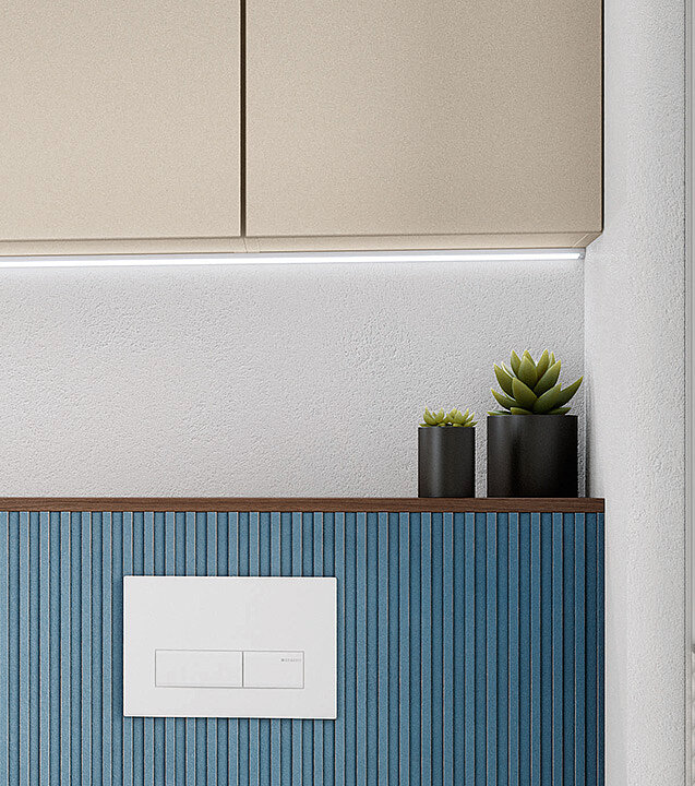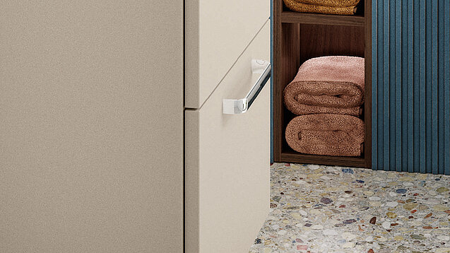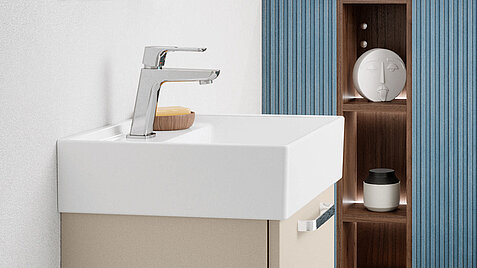 Light, neutral colors and cleverly integrated storage space make smaller bathrooms appear larger. The focal point: a hand basin with practical drawers or pull-outs.