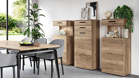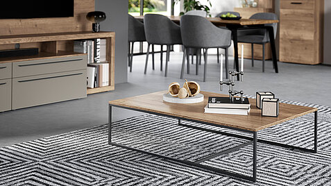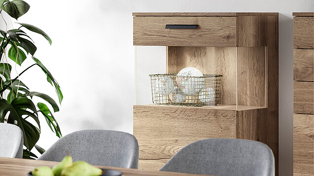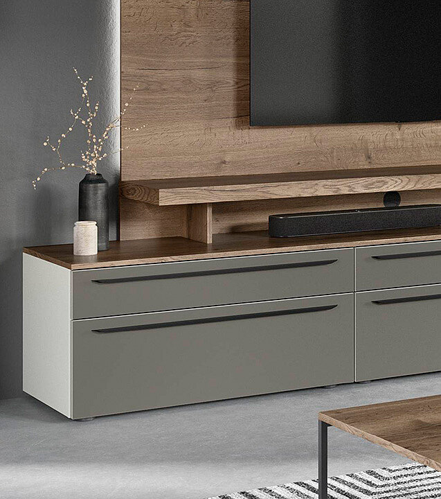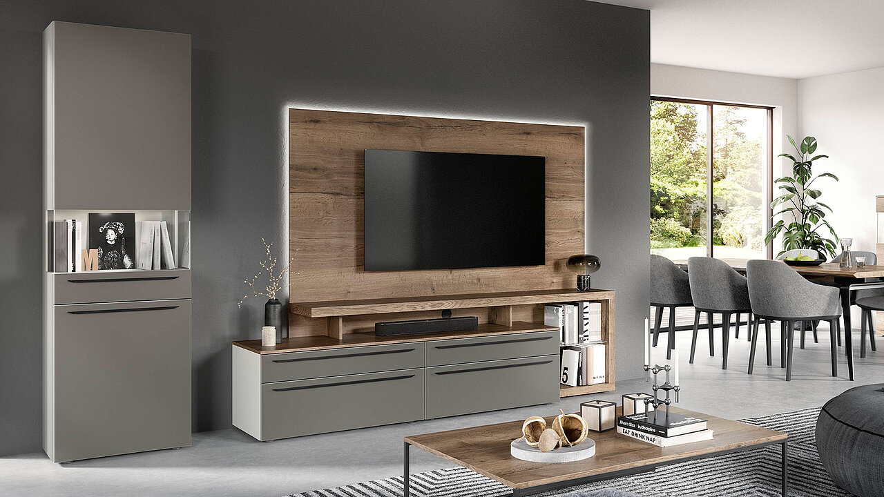 Oh, happy grey! Taupe grey looks homely and can be combined in many ways. Discover your own personal eye-catcher, e.g. the solitary display cabinet with corner glazing on both sides and the media console with indirectly illuminated media panel. Here, the cable aperture makes all cables disappear.