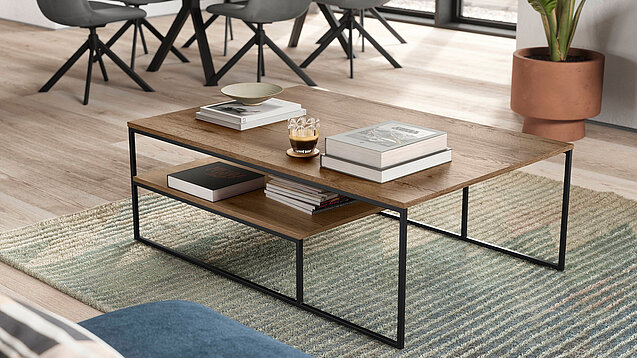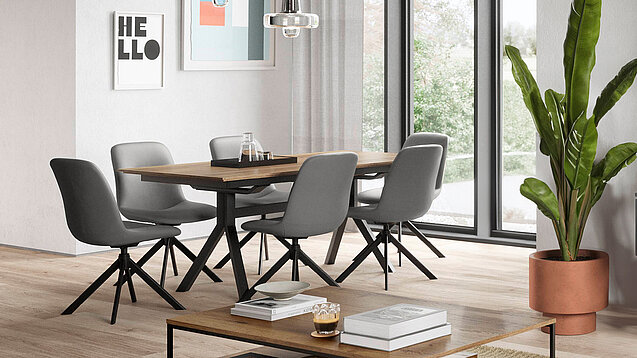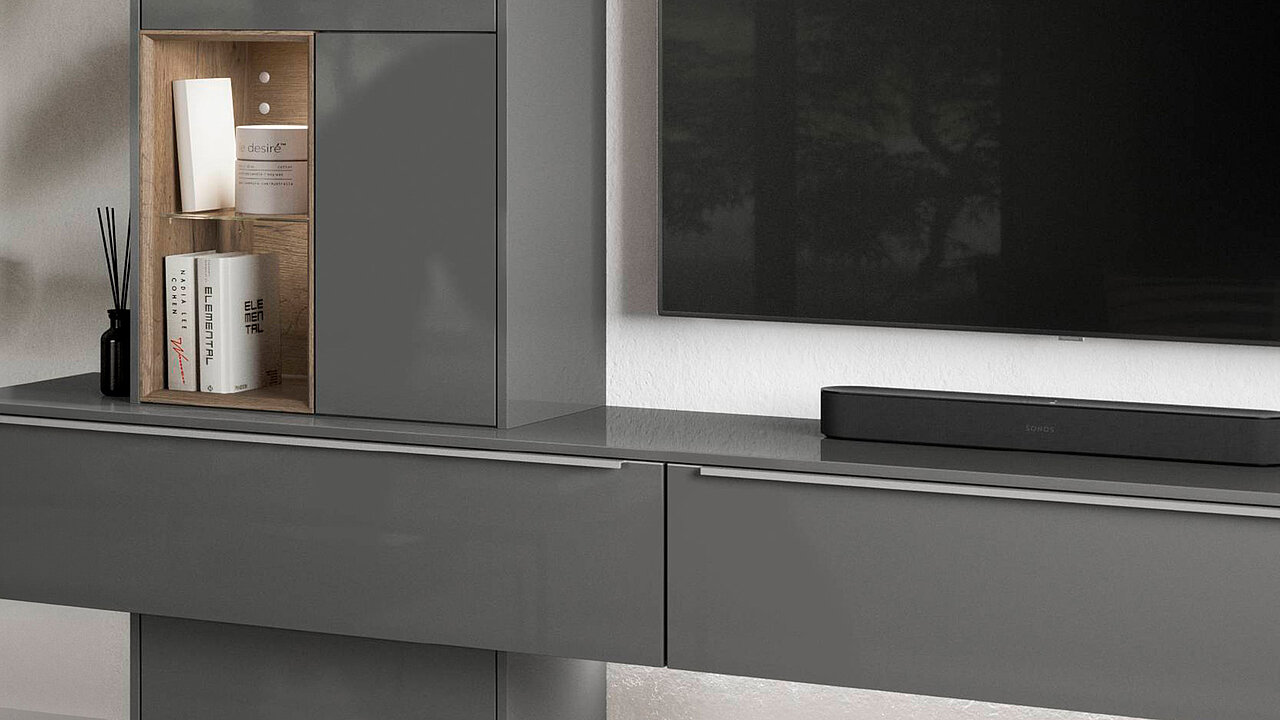 Bring modern style and natural warmth to your living area with living furniture in a slate grey high-gloss finish with Havana oak. This trendy combination gives your home a harmonious and stylish ambience – plan your living room or dining area with furniture that perfectly combines design and functionality.