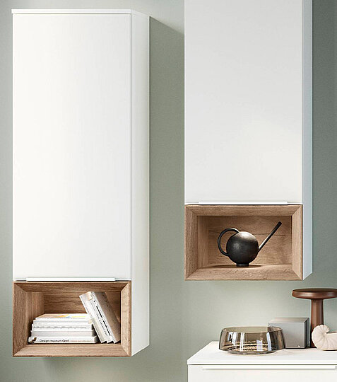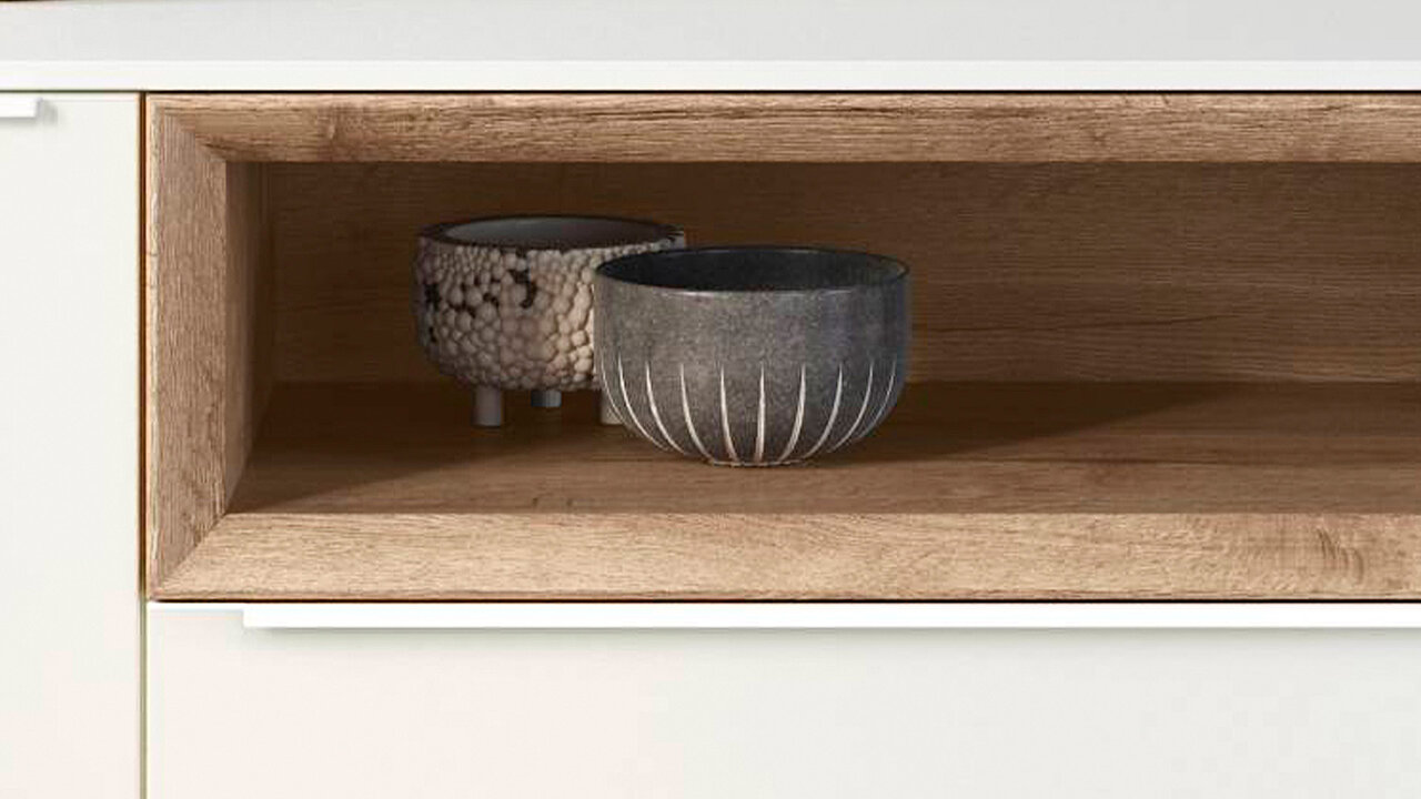 Give your living room an elegant and modern touch with furniture in alpine white high-gloss. The fronts not only shine, but also offer practical cube shelf inserts that provide additional storage space and an aesthetic design. Whether as a sideboard or wall units, these pieces of furniture combine clean lines and an ultra-modern look that fits perfectly into any living room.