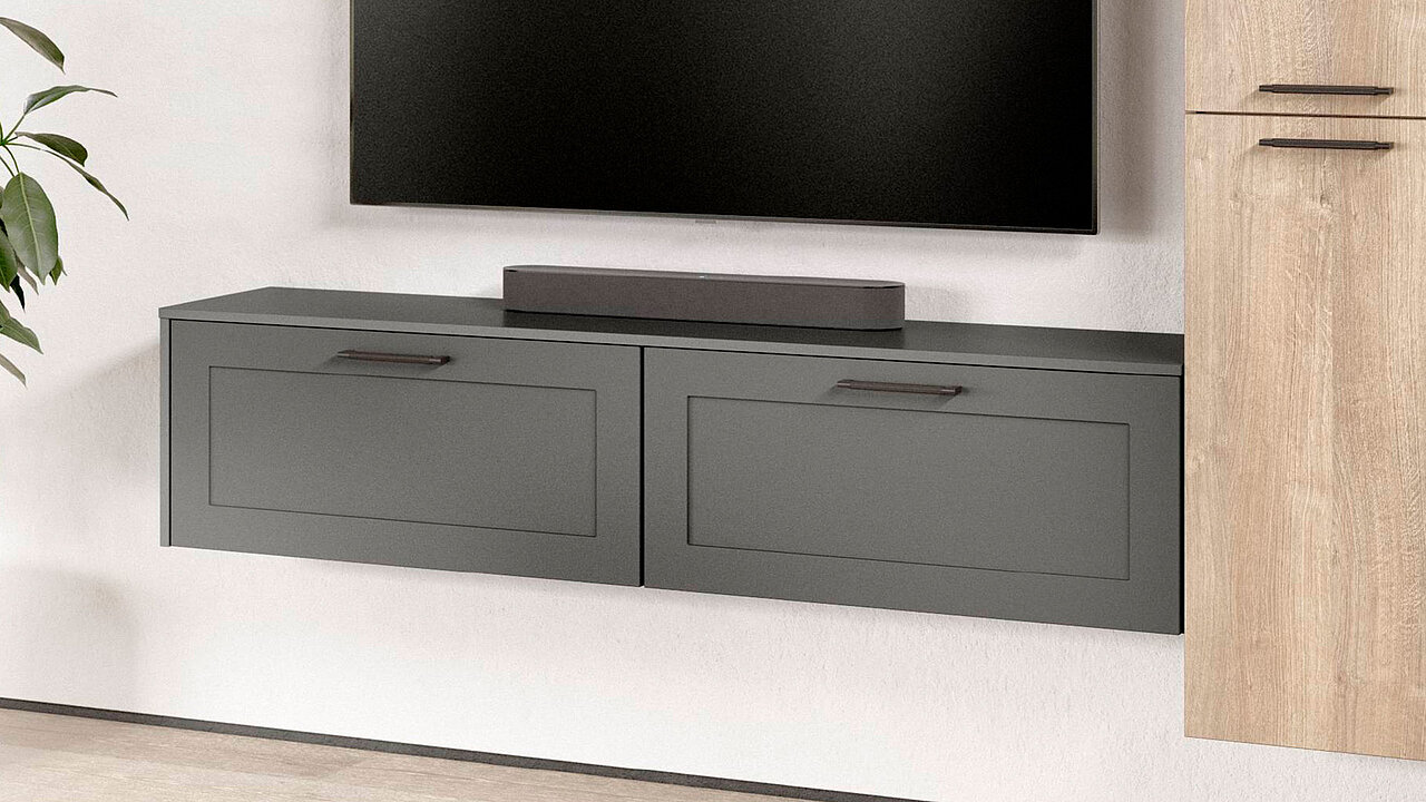 Set modern accents in your living room with a TV console in slate grey matt. The matt surface ensures an elegant and timeless look, while the oak-look wall unit with warm wood tones creates a harmonious overall look.