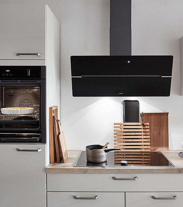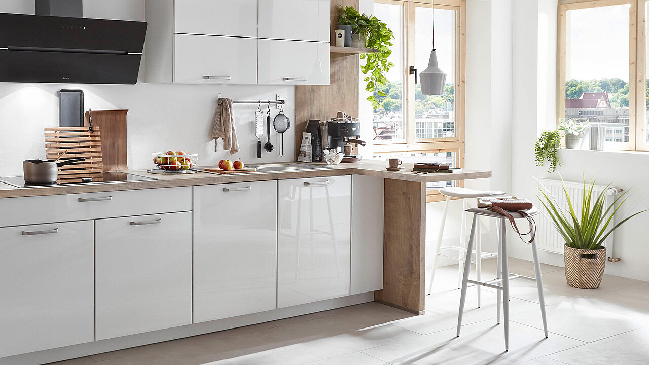 Glossy white kitchen modules harmonise perfectly with the warm Master Oak wood decor and create cosy contrasts in the smallest of spaces. The worktop has been creatively extended as a counter. Perfect for starting the day with a cup of coffee.