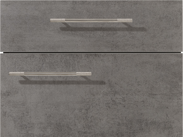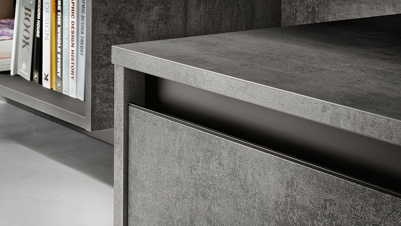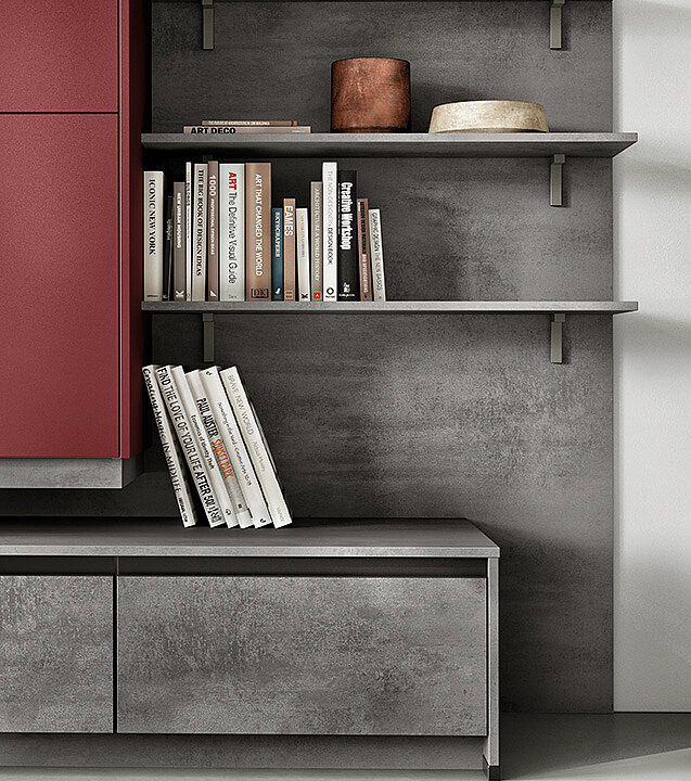 An individual ensemble with a wow effect. The concrete-look back panel creates the perfect frame for contrasting cabinets in rust red with ultra-matt anti-fingerprint surfaces.