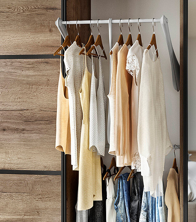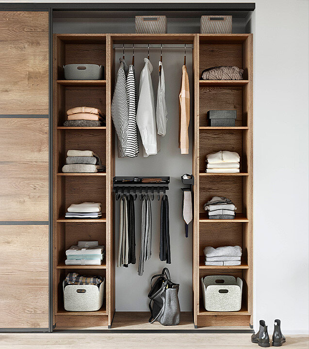 Give your bedroom a stylish ambience with a closet with sliding display cabinet doors. This classic piece impresses with its versatility and versatile design options. The generous sliding doors create a modern design and conceal practical storage space for your clothes, accessories and more.