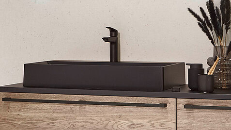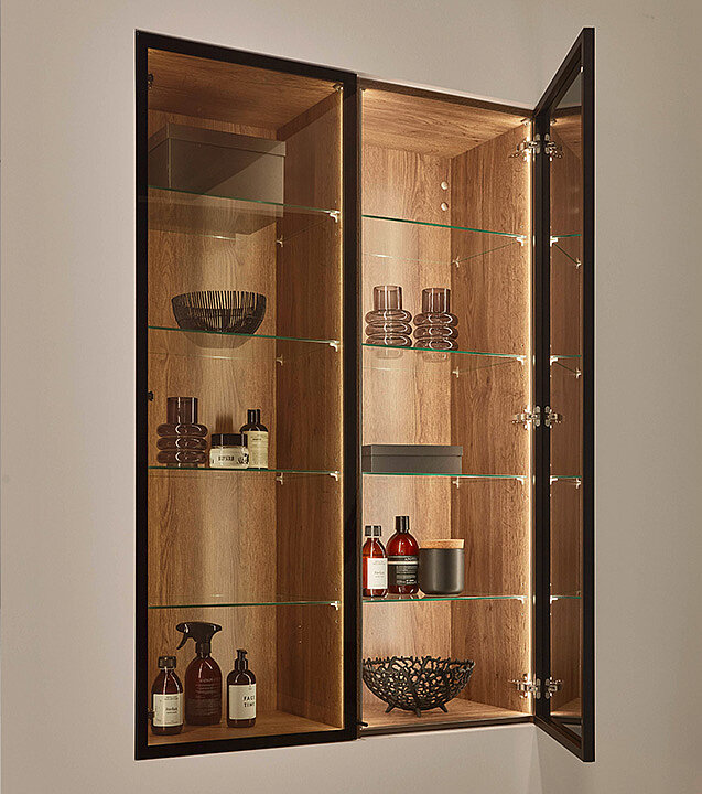 For all those who love natural living: This bathroom design combines functionality with timeless aesthetics. The warm oak Havana decor creates an inviting atmosphere, while the illuminated wall shelf offers stylish storage space.