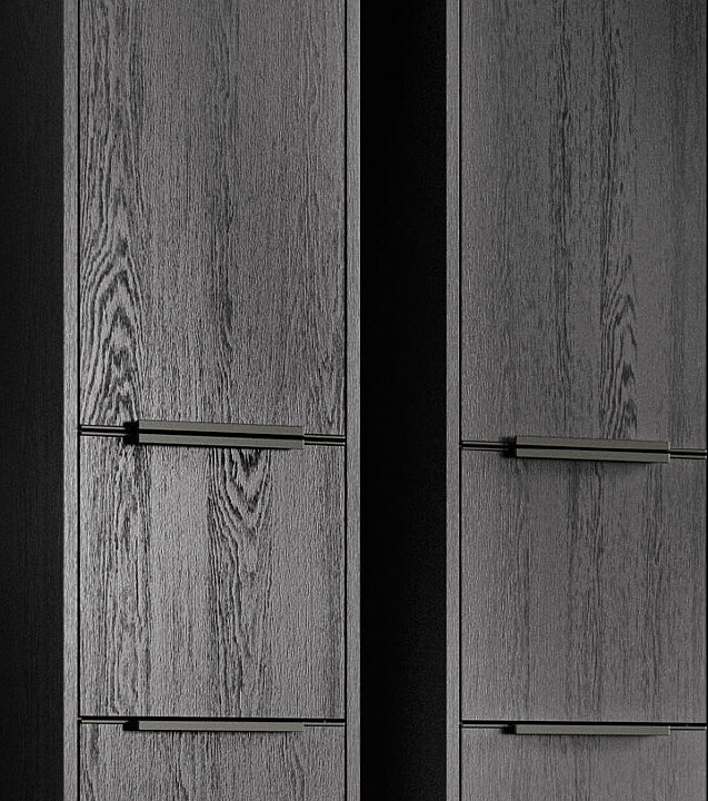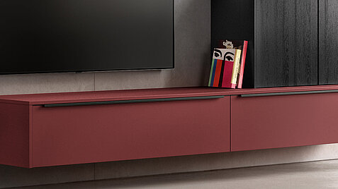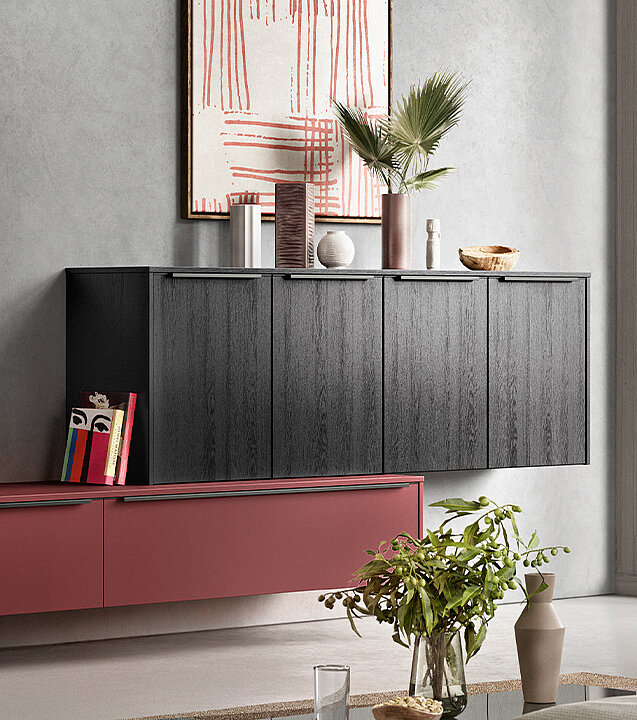 Living room furniture that immediately catches the eye thanks to the deep shade of the nero oak reproduction – but that’s not all: the rust-red color accent gives the room concept a lively, modern touch. Perfectly coordinated by the structure of the oak reproduction and the minimalistic handle strips, this plan impresses with its many details.