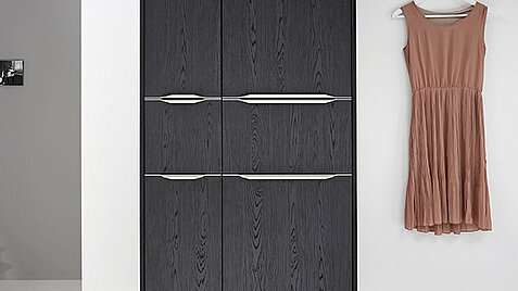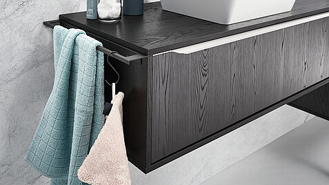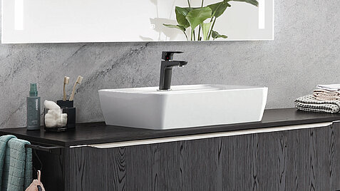 This bathroom design is the perfect choice for lovers of clean lines and subtle colors. The dark wood nuances of the Nero oak lend the room depth and elegance, while the smooth glass surfaces with their clear structure provide a modern accent. The result: an all-round harmonious overall look.