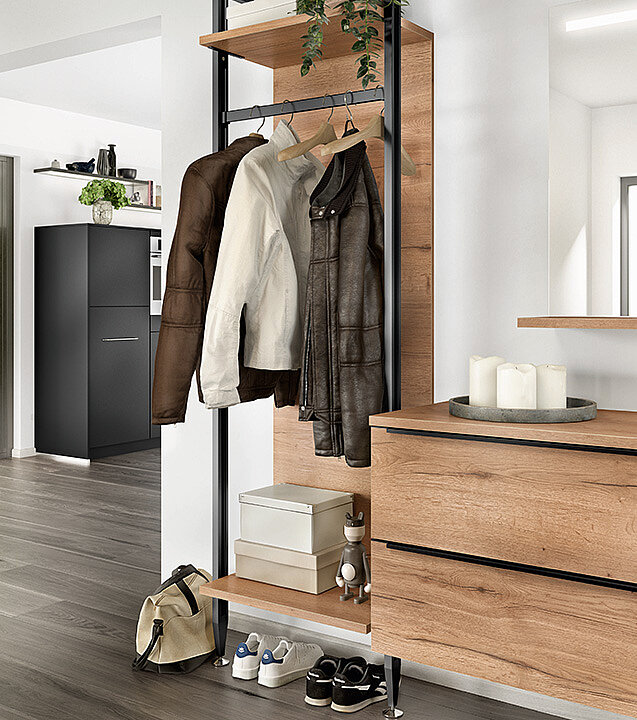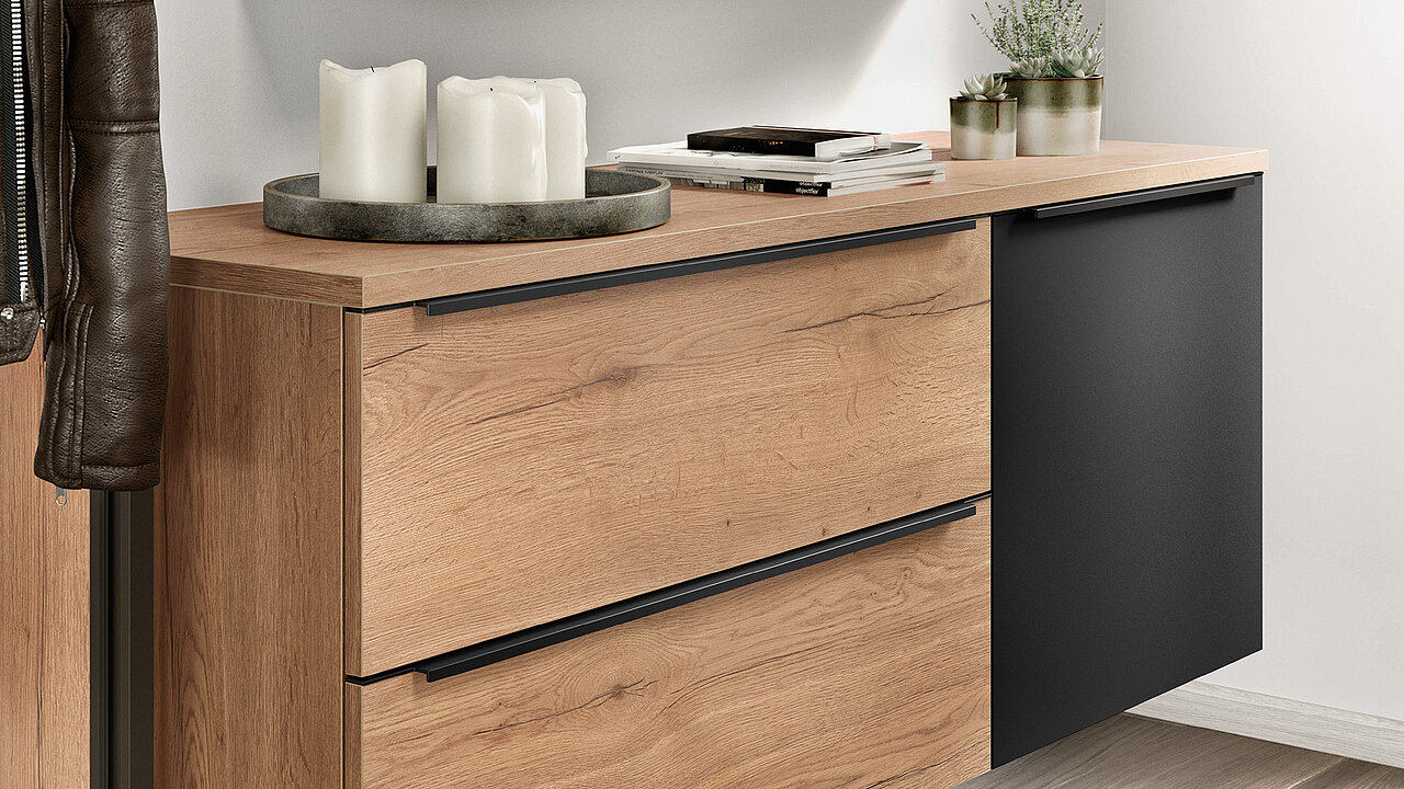 Design your entrance area with modern hallway furniture in Sierra oak. This furniture combines a warm wood look with clean lines and is the perfect choice for a stylish home. The black handle strips create subtle, elegant accents that underline the modern character of the furniture.In addition to a storage area for keys, bags or decorations, the set is complemented by a stud shelf in Sierra oak, which creates additional space for shoes, baskets or accessories.