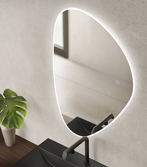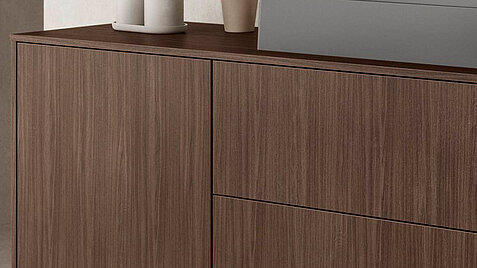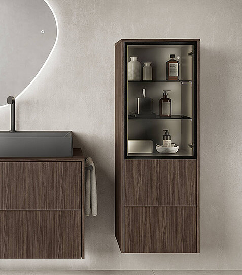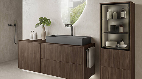 Clear forms and warm walnut tones add a modern touch of elegance to the room, whilst the accentuated lighting puts the colour depth of the wooden décor in just the right light. A contrasting effect that creates a relaxed atmosphere.Our Midi unit ensures that care products and bathroom accessories are always within easy reach – a practical bathroom furniture solution that combines convenience and organisation.