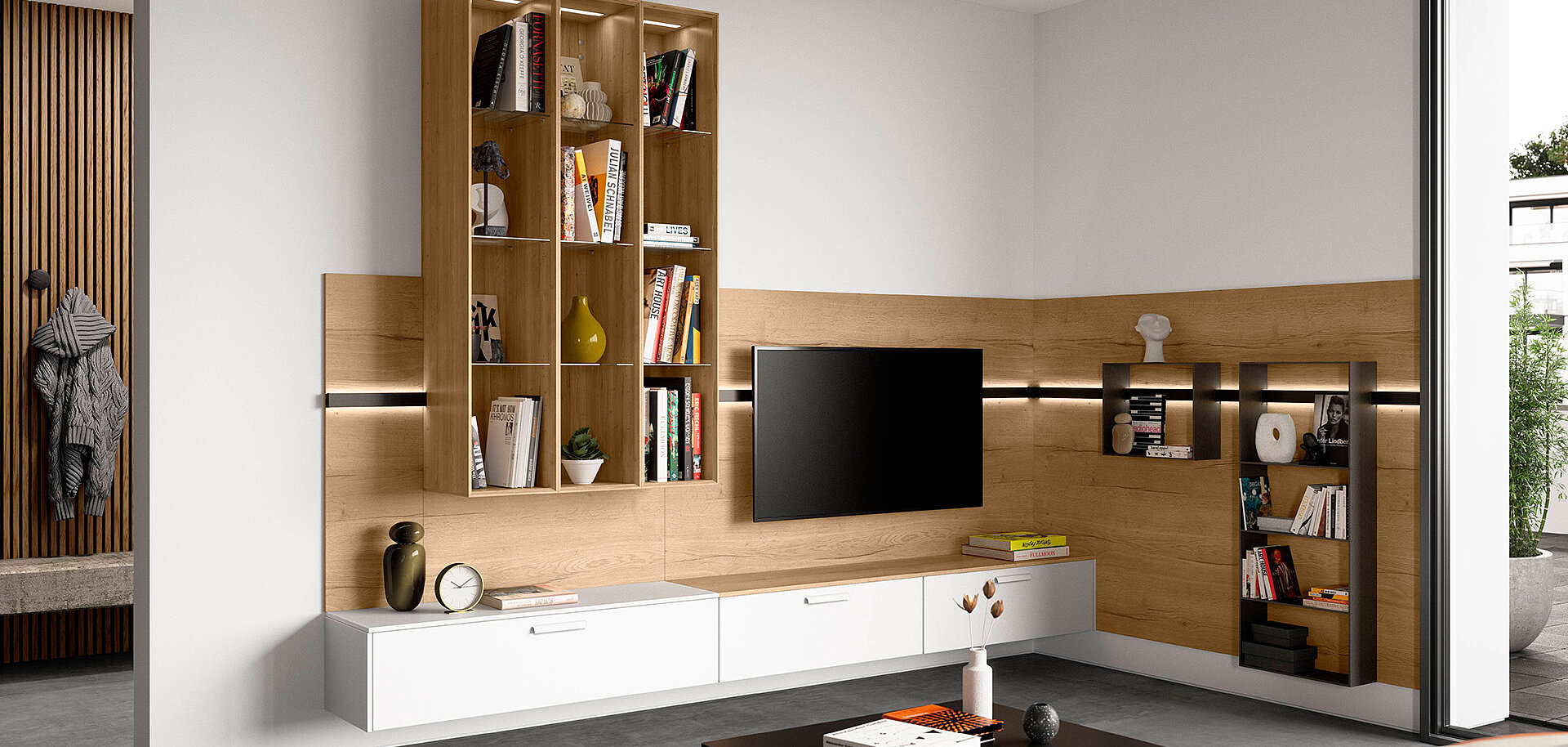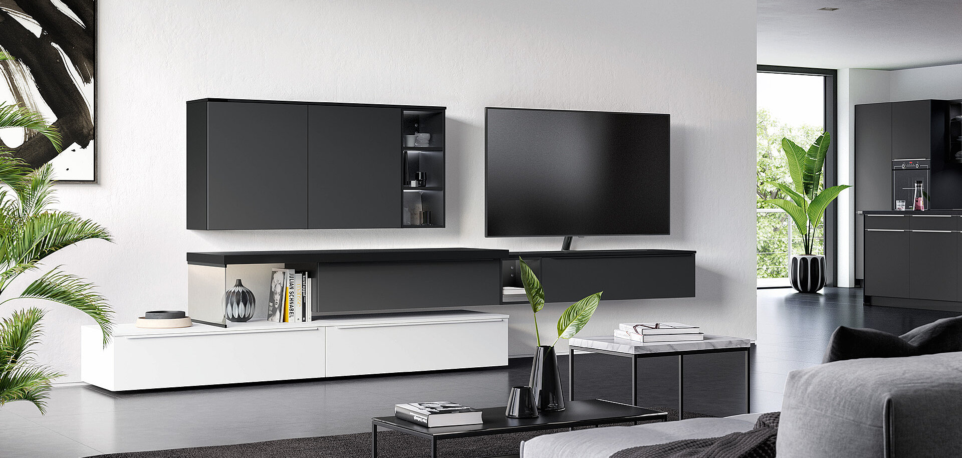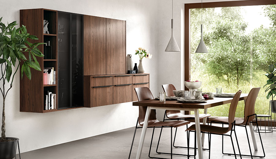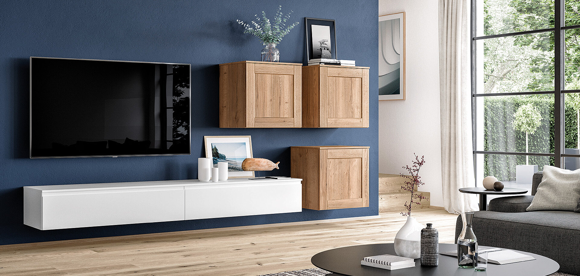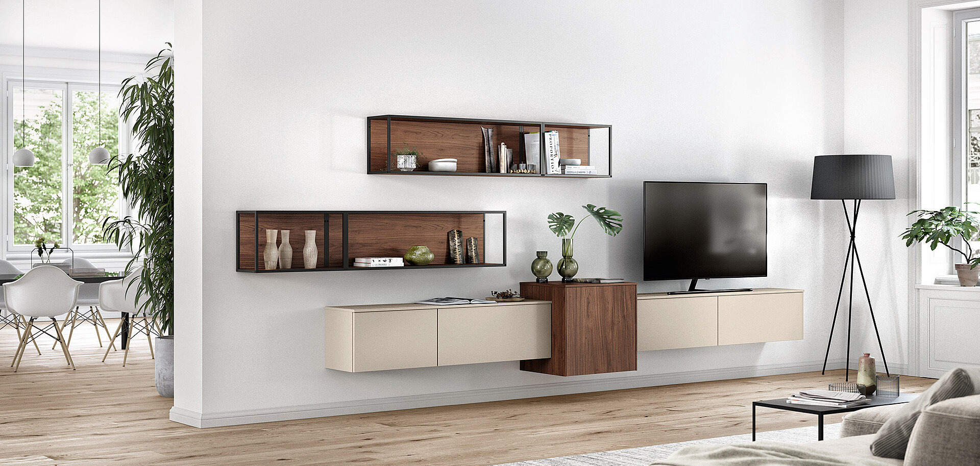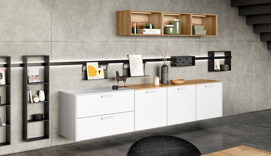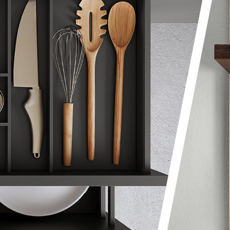 When designing your new kitchen, include the adjacent living areas in your concept as well. You can furnish living rooms, dining rooms and wardrobes in a unified design style with your open concept kitchen using carcase elements, shelving systems and wall shelves.