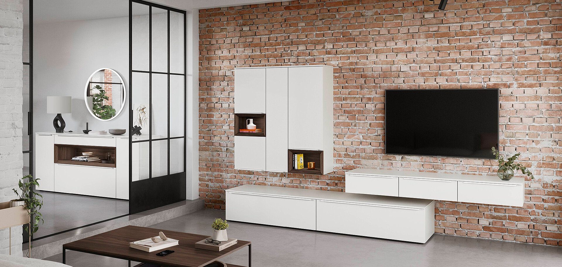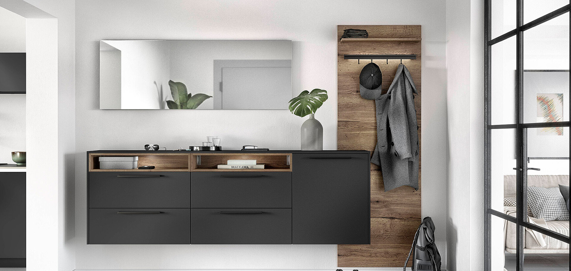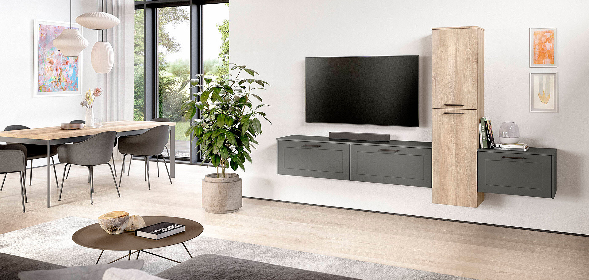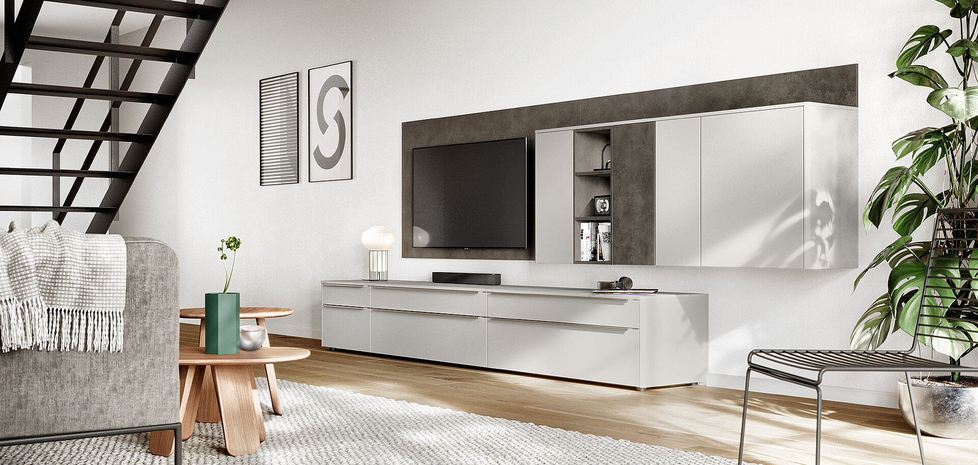 When designing your new kitchen, include the adjacent living areas in your concept as well. You can furnish living rooms, dining rooms and wardrobes in a unified design style with your open concept kitchen using carcase elements, shelving systems and wall shelves.