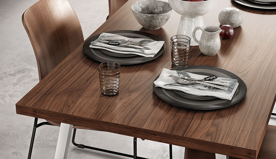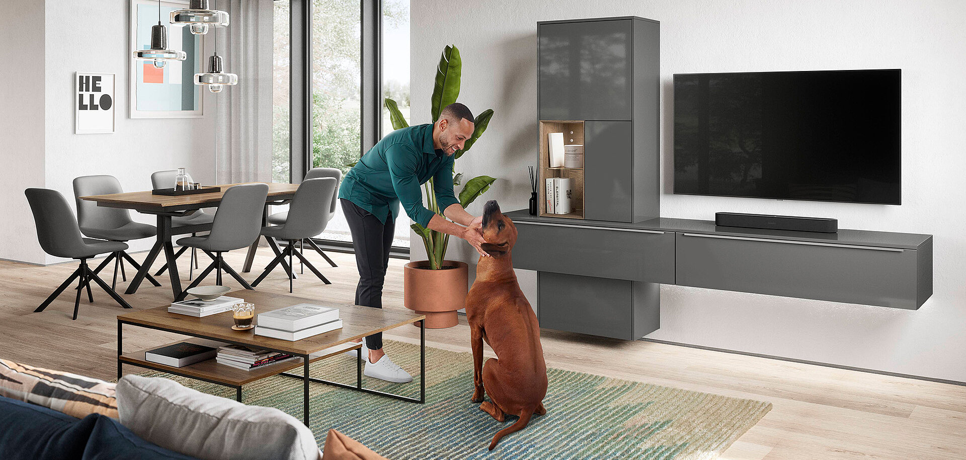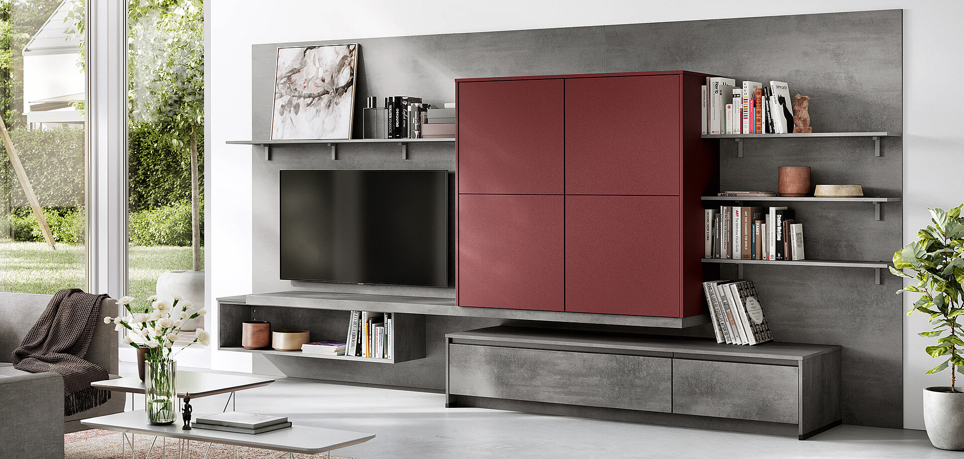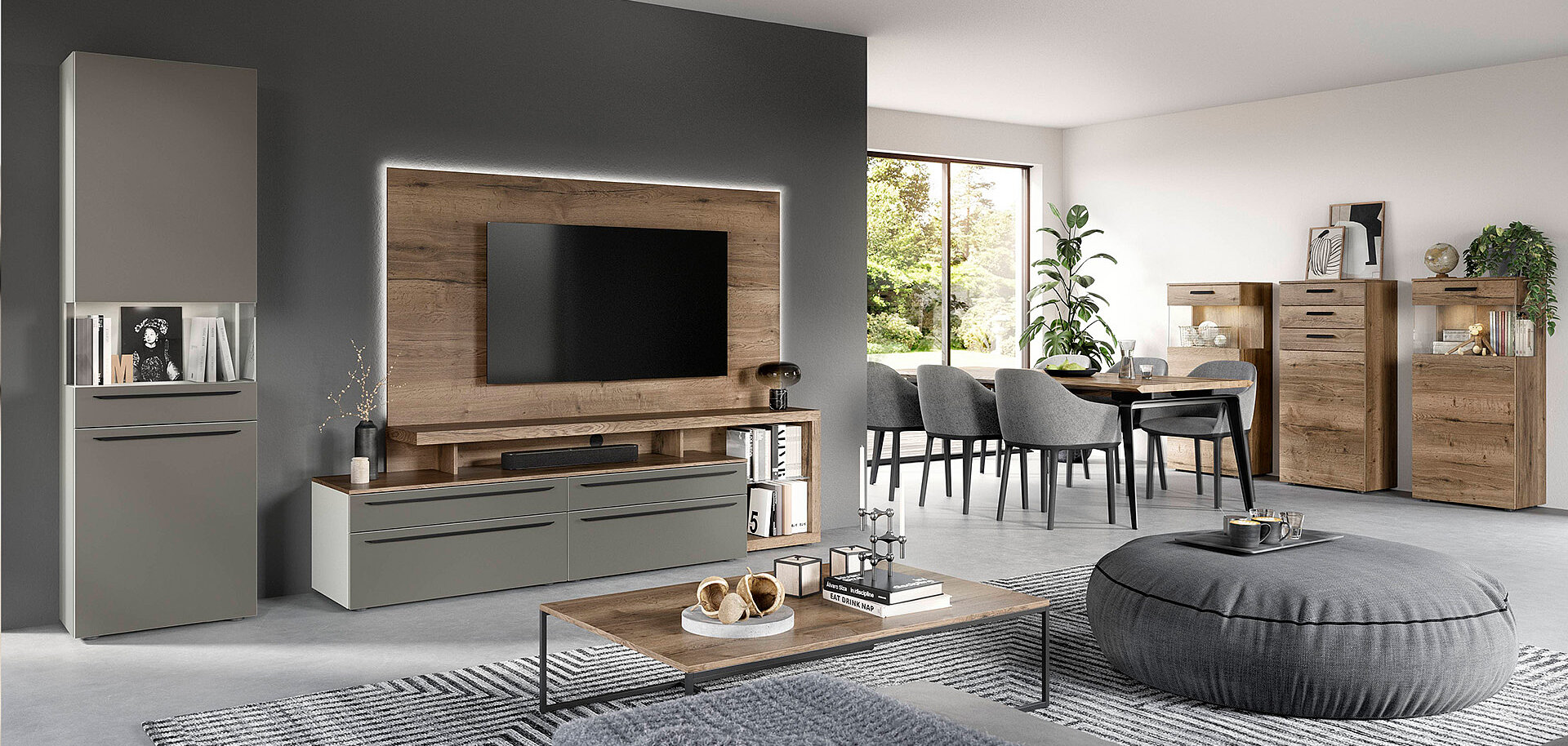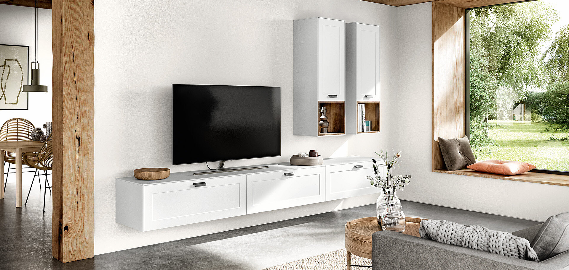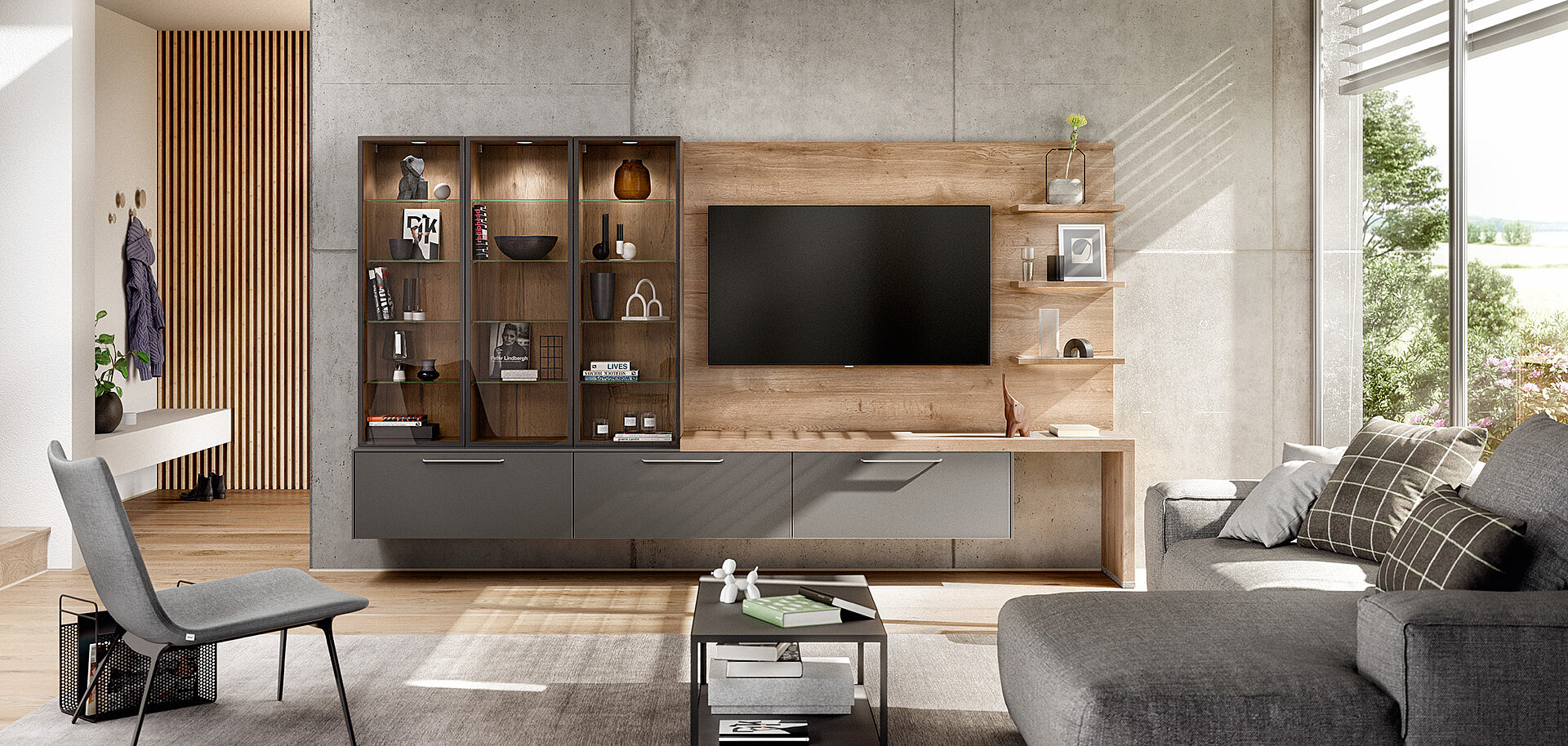 When designing your new kitchen, include the adjacent living areas in your concept as well. You can furnish living rooms, dining rooms and wardrobes in a unified design style with your open concept kitchen using carcase elements, shelving systems and wall shelves.