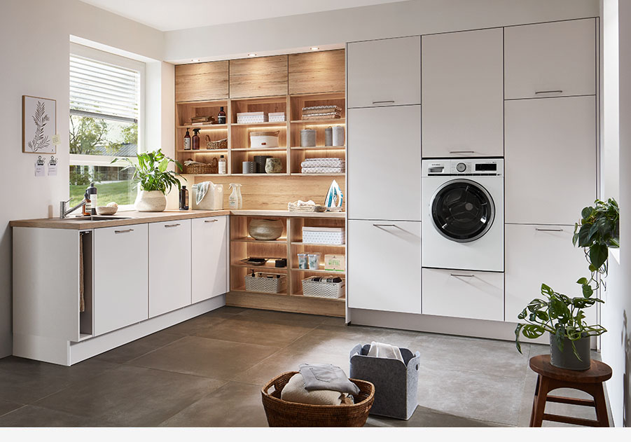 Where to put all the things that we use on a daily basis, but that shouldn’t be visible to everyone who enters the kitchen? They can end up in the basement, out of the way. But then they are no longer readily accessible for everyday use. Moreover, many single family homes or flats today no longer even come with basements. This has led to a revival of the utility room. Since this room often must serve many functions within a small footprint, a design that is both functional and ergonomic, with clever customisable solutions is an absolute must.